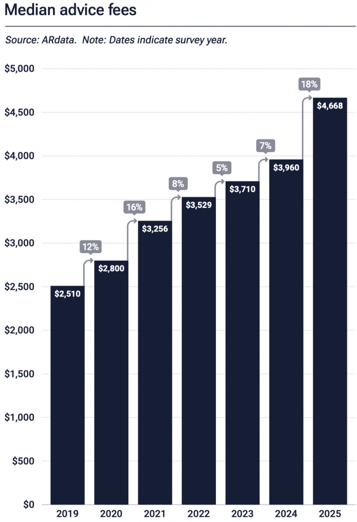 Median ongoing advice fees in Australia have reached record highs, climbing 18% to A$4,668 over the past 12 months, according to the 2025 Australian Financial Advice Landscape Report.