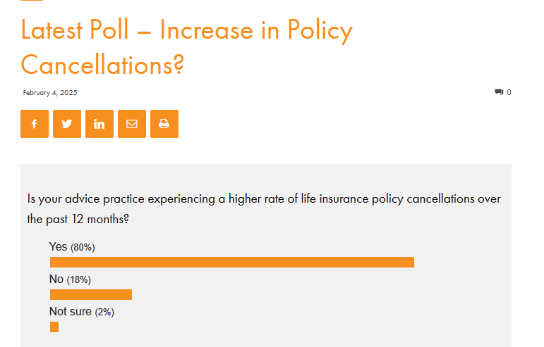 In our February 2025 poll 80% of advisers agreed they had seen more policy cancellations with just 18 percent disagreeing with the premise. So has anything changed over the past 10 months?