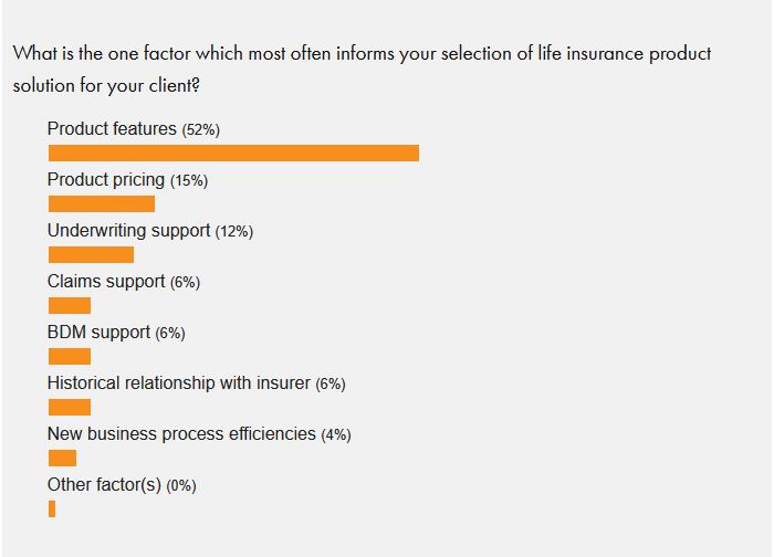 Our latest poll result indicates that for nearly half of advisers product features is the one factor which most often informs their selection of life insurance product solution for their clients.